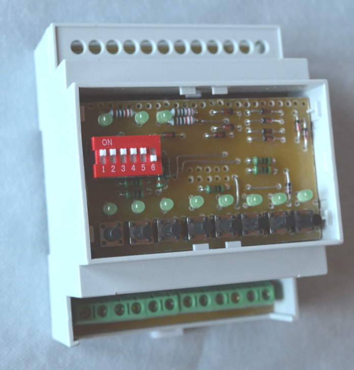 8 Taster können parallel zu BUS Signal geschaltet werden. Anwendungen sind manueller Betrieb (ohne BUS) und Testbetreib für Relays