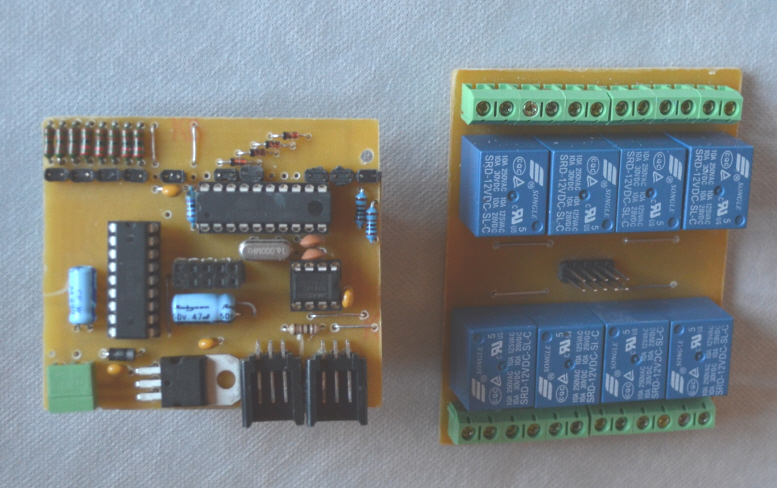 Es ist ein kompaktes 8 Relay (Wechsler) Modul, basierend auf der 8xOutput Schaltung des E2000 Teams. Zusätzlich dazu kamen 8 Relays, 8 Taster und 6-fach DIP Schalter.