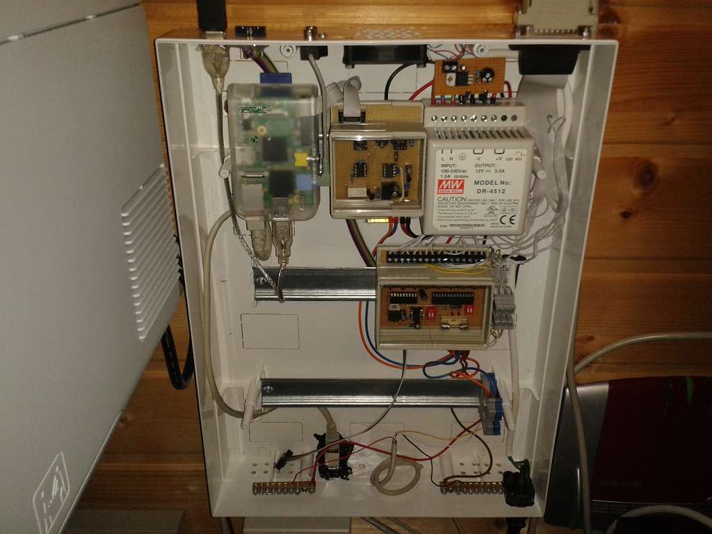 Die USB Buchse, der Sound, ein 10 Pol Pfostenstecker für die Funksteckdosenbedienung und ein 25 Pol Sub- D Stecker für die Stereoanlagenbedienung gehen oben aus dem Kasten. Netzwerk, Bus und 230V~ gehen unten aus dem Kasten.