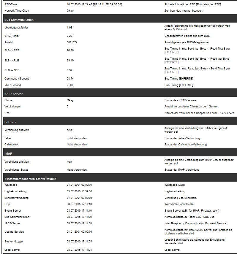 Die Busmodule mit gleicher Zehnerstelle, also Modul 10 und 11 oder 20 und 21 sitzen je in einer Kiste. Die Module mit den 40er Nummern sitzen 15m hinter den 30er Nummern. Trotzdem Passieren bei den 30ern mehr Fehler. Haupt Fehlerquelle ist das Garagentormodul (Multi-I/O). Die Steuerung lief aber mit 2.0c auch schon problemlos bis auf die Neustarts und ab und zu die Hänger mit 0Hz die einen Reboot von Hand wollten.