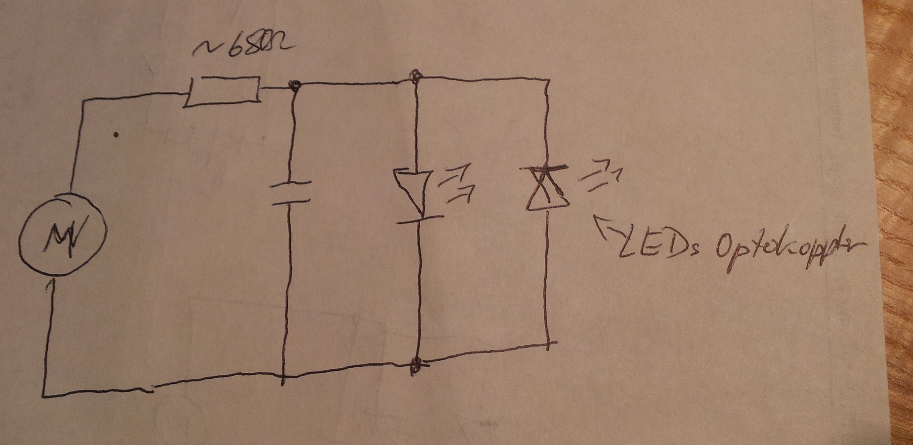 Ich werde WE versuchen, direkt am Motor die Spannung abzunehmen und vielleicht gleich über Dioden und einen 7805 eine saubere Spannung für jede Drehrichtung zu gewinnen. Ich lade mal meine Idee als Bild hoch.... div. Feinheiten im Schaltplan fehlen natürlich. Werde mich überraschen lassen, ob es funktioniert, da der eine Pol ja nicht wirklich negativ, in der Form von GND ist. Gegen GND fällt mir momentan nichts einfaches ein.