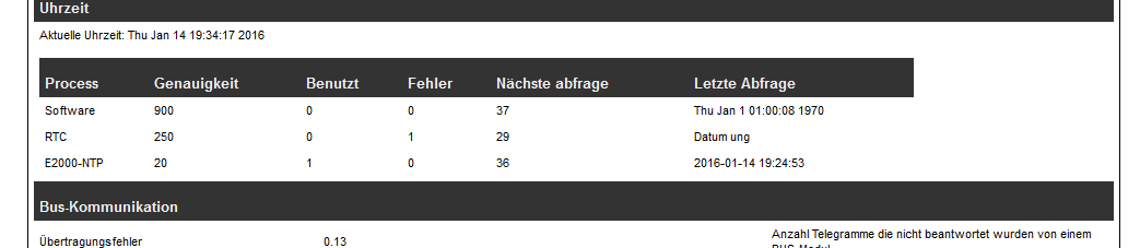 ich hab mal eine Frage zum E2000- NTP Server. Auf der Webseite meines Raspi steht beim Starten bei benutzt eine „1“. Manchmal nach Stunden oder auch Tagen steht da eine „0“ und bei Fehler eine „1“. Ich nehme an, dass die Verbindung zum NTP- Server unterbrochen war. Dieser Zustand bleibt aber dauerhaft. Heisst das, dass die Verbindung nicht mehr hergestellt wird, oder aber, sie wird wieder hergestellt und die „1“ bleibt bei Fehler stehen? Gruß Joba |
