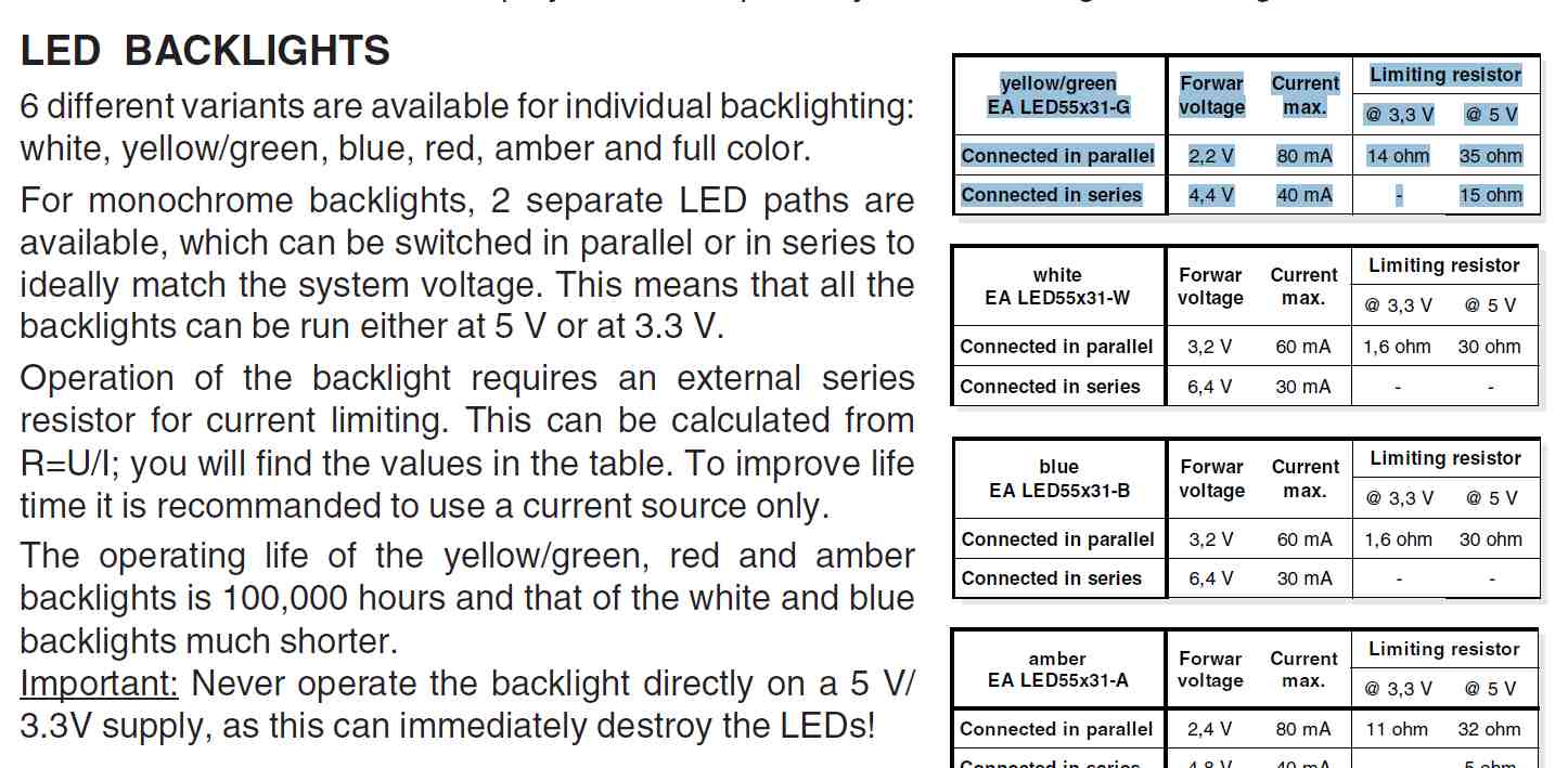 Wie im Schaltplan ersichtlich sind die LEDs zur Beleuchtung Parallel geschaltet Pin 2+19 gegen GND. Beachte dass bei 80mA und 5V schon fast ¼ W abfallen. Bei voller Helligkeit wird ein ¼ W widerstand schon richtig Warm. Abhilfe 50 Ohm macht 0,16W und die Helligkeit reicht auch aus oder die max. Helligkeit in der Config runter stellen oder beides. Gruß Falko _________________________ 2xRaspberry Pi3 mit 23 und 6 Modulen,1xRaspberry Pi2 mit 6 Modulen 1xRaspberry Pi3 zum Testen mit 3 Modulen 1xRaspberry Pi3 mit 2 Multi IO als Akkutester |