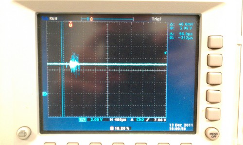 Danach habe ich nochmal das 5V Netzteil genommen und einen 2200 uF Kondensator paralell zur versorgungsspannung gehangen. Danach waren die Spitzen etwas abgeschwächt.