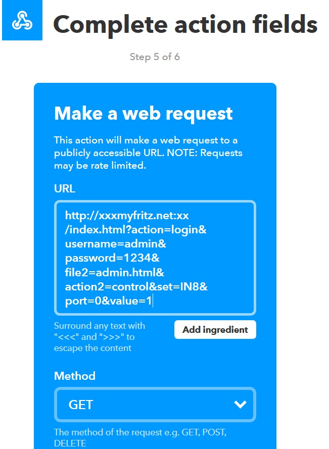Hallo, ifttt und E2000...sehr interessant! Leider funzt es bei mir nicht? Den http-Befehl kann ich im Browser, auch im Handy und außerhalb meines Heimnetzes (myFritzDNS) ohne Probleme eingeben, funktioniert. Kopiere ich aber den Befehl ins IFTT-Applet, keine Funktion, nur "wird an ifttt gesendet"? Hier mein http-Befehl: http://xxxmyfritz.net:xx/index.html?action=lo[...]t*IN8$port*0$value*1 (Eingang 8 soll geschaltet werden), die "x" stehen für die DynDNS Adresse, bzw. Port. Wie gesagt, Befehl im Browser eingeben, klappt! Danke schon mal, Steffen