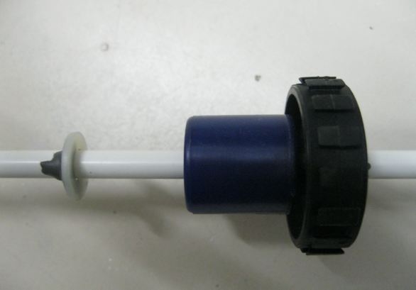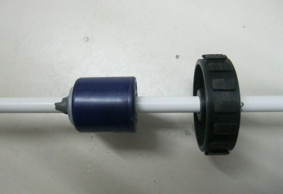 Die Reedkontakte habe ich an den entsprechenden Stellen jeweils an eine Doppelader des Kabels angelötet und mit Schrumpfschlauch fixiert. Dann habe ich die das abisolierte Kabel in das PVR-Rohr eingezogen und unten sowie oben mit 2-K-Kleber verschlossen. Jetzt habe ich die Schwimmer mit den Scheiben auf das Rohr geschoben, die Schaltpunkte mittels Durchgangsmessung gesucht und die Scheiben als Begrenzer ebenfalls mit 2K-Kleber fixiert. Damit mit die Geber nicht in Ihrer rauhen Umgebung kaputtgehen, habe ich das ganze in ein Schutzrohr gesteckt (HT-Rohr). Im Deckel sind noch zwei Löcher, die die Luft raus lassen. Da ich am anderen Kabelende noch einen RJ45-Stecker dran hatte und den anderen Stecker noch übrig hattte habe ich mittels eines RJ45-Verbinders einen steckbaren Anschluss an der Steuerung. Die Steuerung wird übrigens im Keller installiert. Jetzt noch zwei Detailfotos.