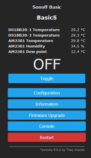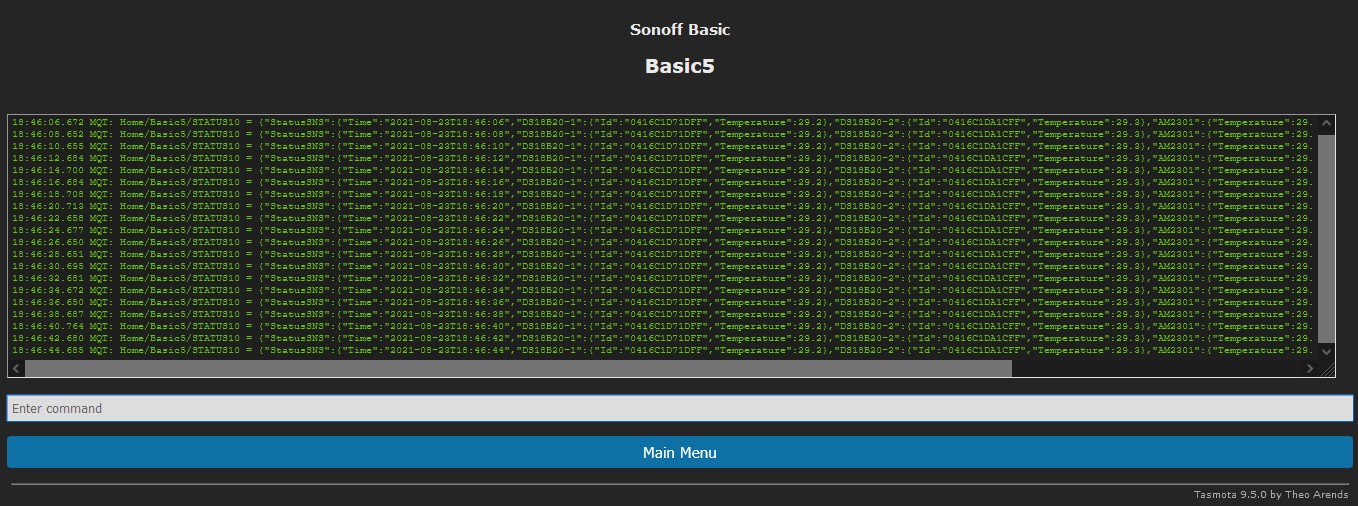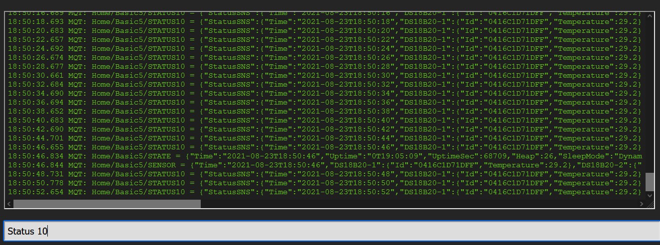 ich dachte Du hättest dich schon mehr mit Tasmota beschäftigt. In Tasmota gibt es ganz viele Commands. Die muss man alle in der Konsole eintippen und ausführen. So vergibt man z.B. auch eine feste IP Adresse. Wie im Bild hier zu sehen gibt es im Hauptbildschirm den Konsolen Knopf. Wenn Du den drückst dann erhallst Du folgendes Bild. Hier werden alle Sachen von Tasmota angezeigt. Es gibt viele verschiedene Statuszeilen. Die ruft man dann auf indem man z.B. wie im Bild unten in die Zeile "Status 10" eintippt gefolgt von Enter. Bei mir wird das sowieso immer per MQTT geschickt. Bei mir sieht die Status-Zeile z.B. so aus: STATUS10 = {"StatusSNS":{"Time":"2021-08-21T18:29:31","DS18B20-1":{"Id":"0416C1D71DFF","Temperature":29.9},"DS18B20-2":{"Id":"0416C1DA1CFF","Temperature":29.9},"AM2301":{"Temperature":30.5,"Humidity":34.0,"DewPoint":12.8},"TempUnit":"C"}} Da kann man die Bezeichnung der Sensoren ablesen und auch die Bezeichnung des gesuchten Wertes. Also z.B. DS18B20-1.Temperature oder AM2301 Humidity oder AM2301.DewPoint Ein logischer Aufbau. Du solltest dich noch etwas damit beschäftigen. Auf deinem Gerät läuft ja auch noch eine 8er Tasmota Version. Wir sind bereits bei V9.5. Hoffe das hilft Dir weiter. Gruß Manfred