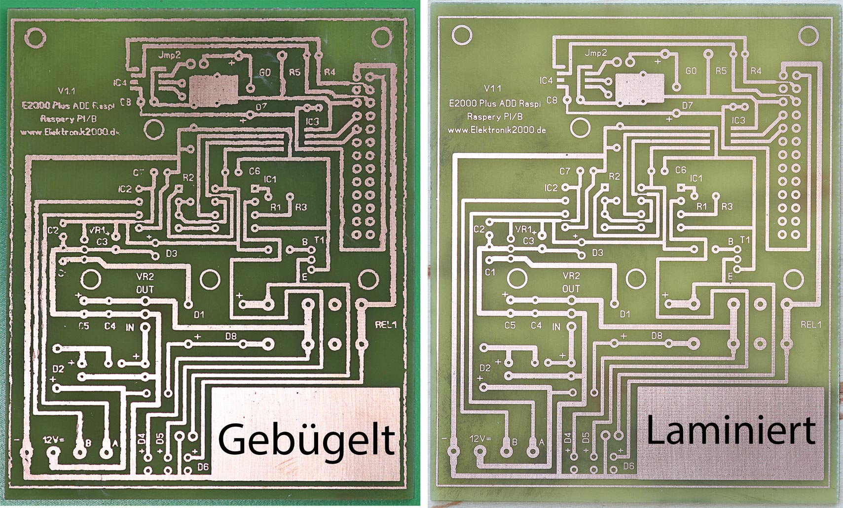 Ich habe wahrscheinlich wie viel andere auch meine Layouts als erstes mit Hilfe eines Bügeleisens und einem leinen Tuch auf die Platine übertragen. Mittlerweile nehme ich ein Laminiergerät. Es ist einfacher, nicht unbedingt schneller aber eindeutig genauer. Gerade bei den schmalen feinen Linien hatte ich Probleme diese genau ohne Unterbrechungen zu übertragen, mit dem Laminierer kein Problem. Ich glaube für Einsteiger (wie mich) ist das eine gute Wahl um gute Ergebnisse zu erzielen. Vorausgesetzt man hat solch ein Teil irgendwo rum fliegen. Gruß Niko |