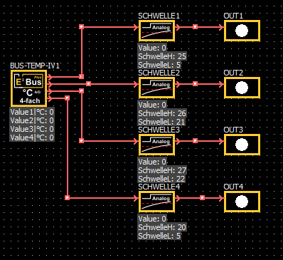 - Im Webinterface auf Bedienpanel gehen - Temperatur Module auswählen - Werte ablesbar oder Hinter den 4 Temperatur Ausgängen jeweils eine Schwelle machen dann kannst du im Live Viewer mit der Maus auf die Linien gehen dort stehen auch die Temperaturen. |